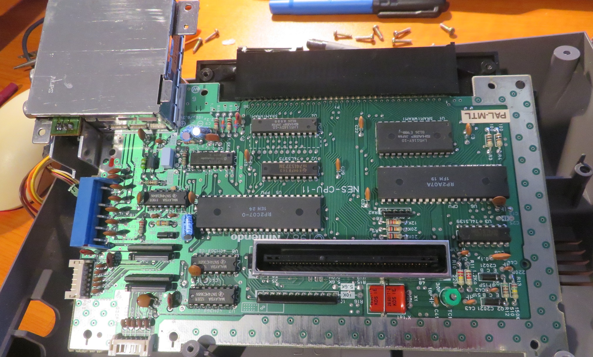 In this image, we can see the motherboard. It is in clean condition for its age and there is no sign of obvious damage.