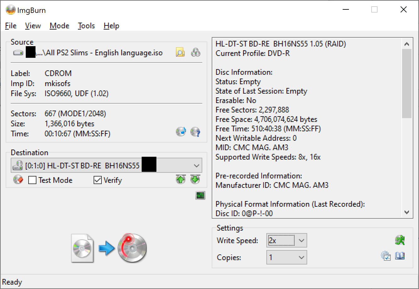 Now we need to get a blank DVD-R and copy an ISO file across. This step is necessary because as of writing this article, it was the only practical way to get the PS2 to boot up the loader to allow files from the USB to be copied to the Sony Memory Card. Once we copy these files across to the Memory Card, then we can boot the PS2 via the Memory Card and no longer need the DVD. This is why it is a cumbersome process but once we have the ability to run a file manager on the PS2 we can copy files and configure further settings which allows the PS2 to run games off the HDD. Copy the ISO file across to your computer and run ImgBurn and load the ISO file to be burnt. Check the writing speed is set to x2